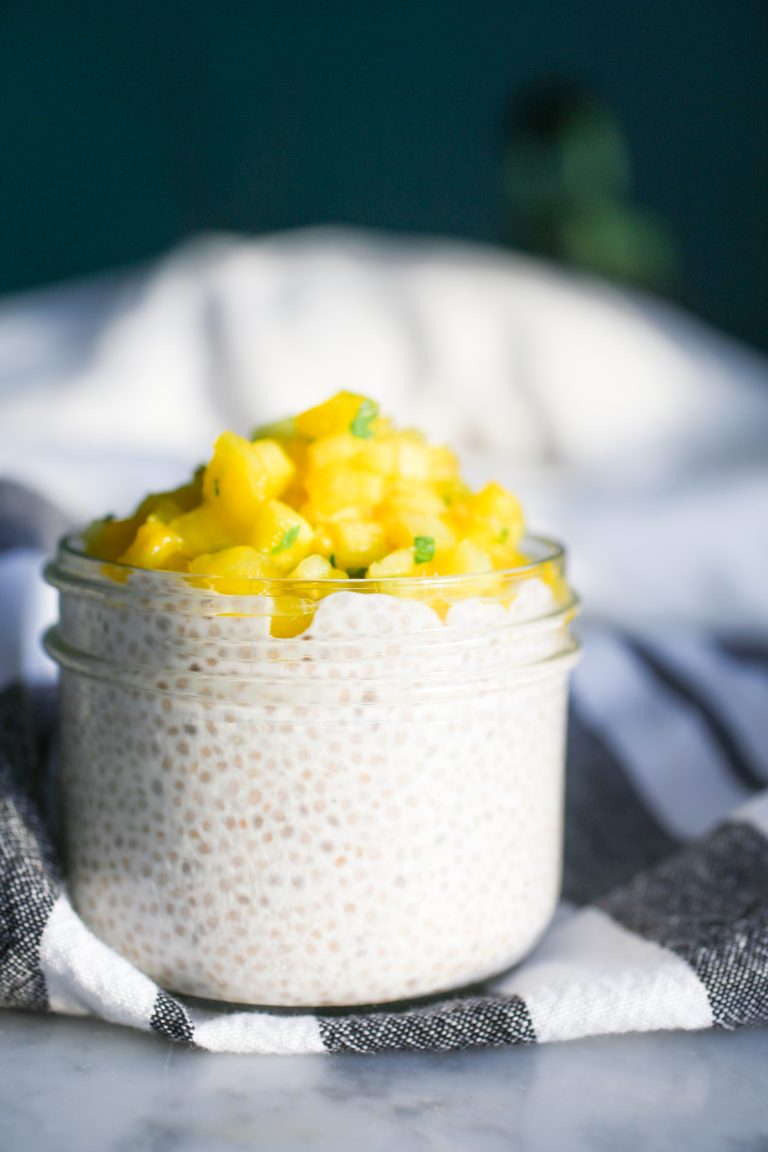 Le pudding de chia est un petit-déjeuner sans fodmaps qui va vous tenir au corps pour la matinée, sans vous ballonner. En plus, il est rapide à préparer. Faites la recette la veille pour un pudding de chia le lendemain matin. Selon la saison, vous pouvez remplacer les fruits exotiques par des fruits de saison (fraises, myrtilles, kiwi…).